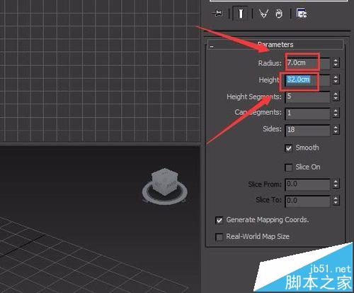 5、选择这个刚刚创建的cylinder物体,在modify里修改radius为7,height为32,作为灯罩,如图所示: