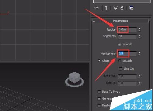 10、选择这个sphere物体,在modify里修改radius为8,hemisphere为0.7,如图所示: