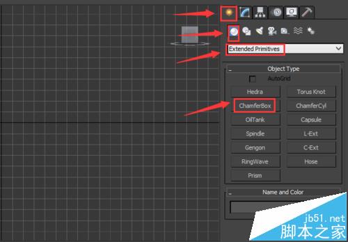 2、在这个界面找到create选项,在create下找到geography选项,在geography里选择extended primitives选项,然后在extended primitives下找到chamferbox工具,如图所示: