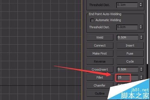 5、选择内部的顶点,在modify里修改fillet的值为25,如图所示: