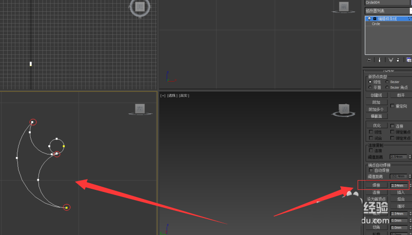 4、进入点物体级别,选择优化工具,并在图示出添加点,进入线物体级别,删除多余线条;