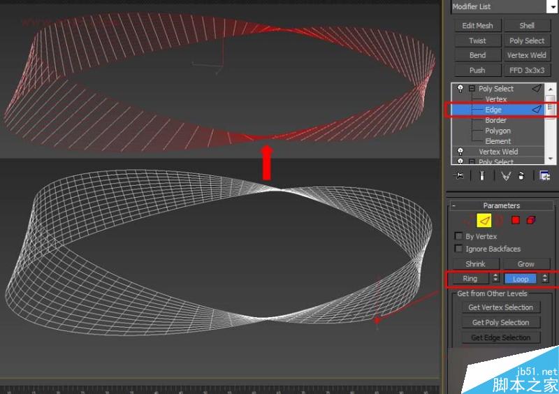 4.莫比乌斯环造型基本完成,但是我们想在环的表面做一些表皮结构,这时我们先去掉壳命令,添加多边形选择(Poly Slect),采用环形(Ring)和循环(Loop)选择沿着外圈的所有边。
