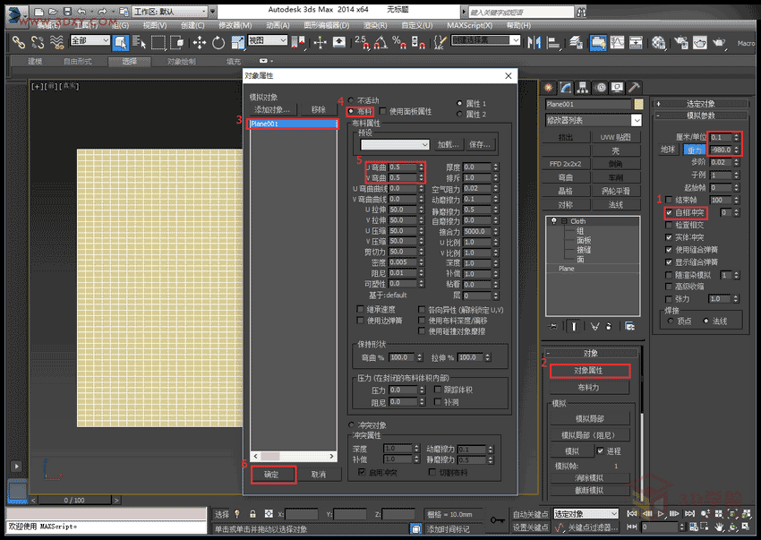 3,退出组层级,勾选自相冲突(为了避免物体本身的面重叠交叉),点击对象属性,选择平面,设置为布料物体,并调整UV值(UV值越小,效果越明显)。