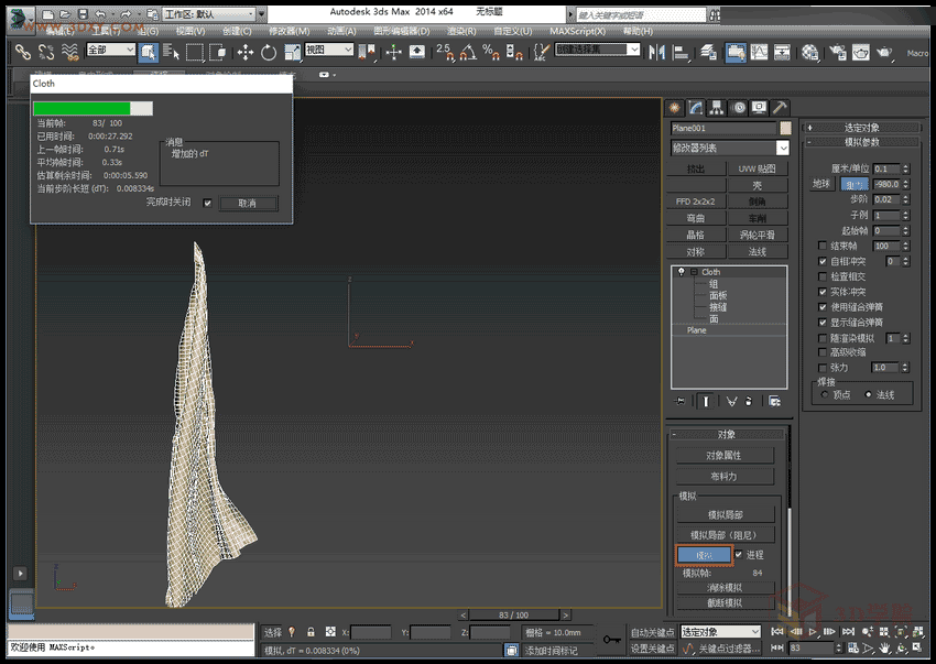 9,设置好之后点击模拟,完成后拖动时间条可以观察整个过程的动态,选择最适合的角度,渲染当前帧。