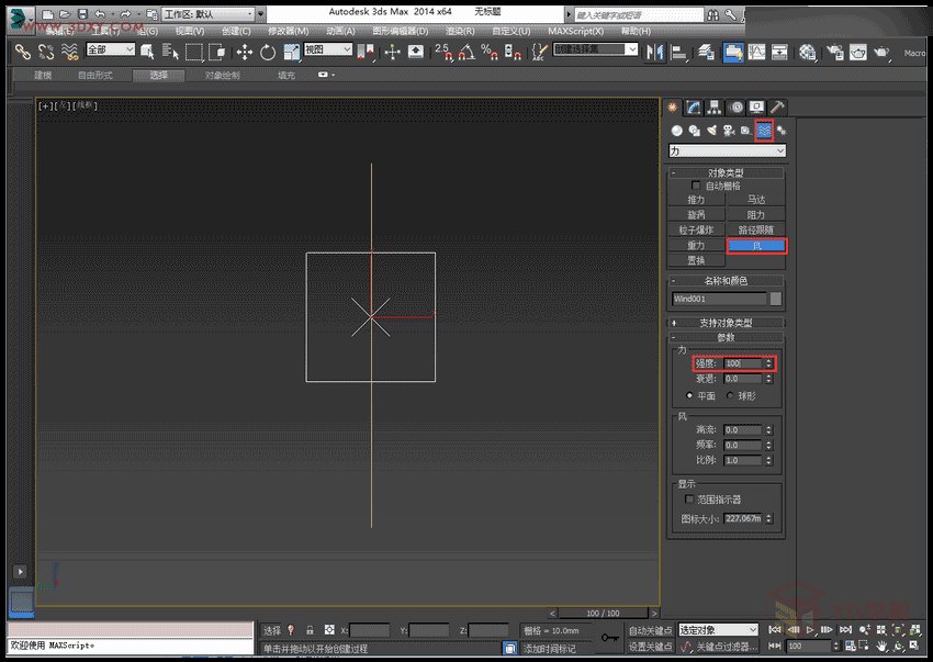 6,在左试图创建一个风,强度100。(创建-空间扭曲-风)
