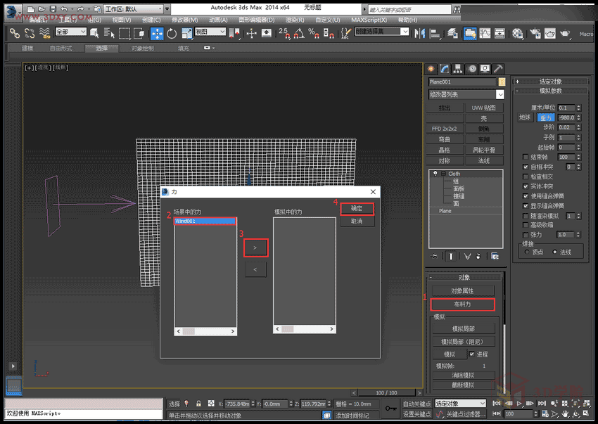 8,选中布料物体,选择布料力命令,在左侧的场景力中选择创建的风(Wind001),点向右的箭头,确定。