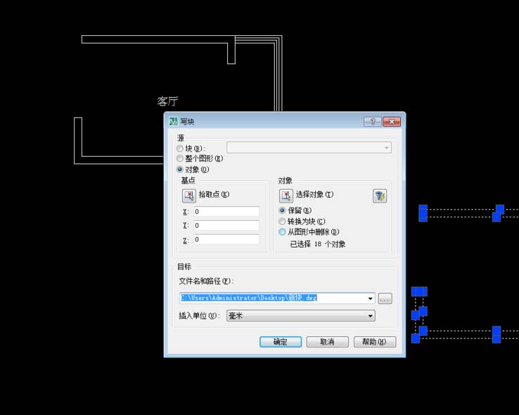 1、作效果图之前我们一般都有相应的户型图。我们就拿一个简单的案例来讲一下,ps:这个是我模拟的客厅图!!!就这样吧!首先在CAD中把你要建模的房间复制一份出来,删除多余的东西,只留下墙线;其次选中这些墙线,按W键,在空格确定,将所选墙线写块(一般我就是放在桌面,文件不大,一会到3d里面要用的哦!)