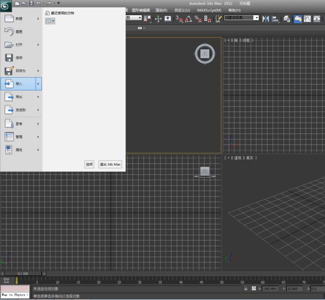 2、打开3d(我的是2012版),按G键将格线关闭;先点击顶视图(最好将其最大化,快捷键是alt+W),然后点击3d左上角的按钮(就是平时保存时按的那个)→点击导入→找到刚才写到桌面的“新块”文件→点击确定;3d会弹出一个对话框,直接点击确定,文件就被导入进来了!