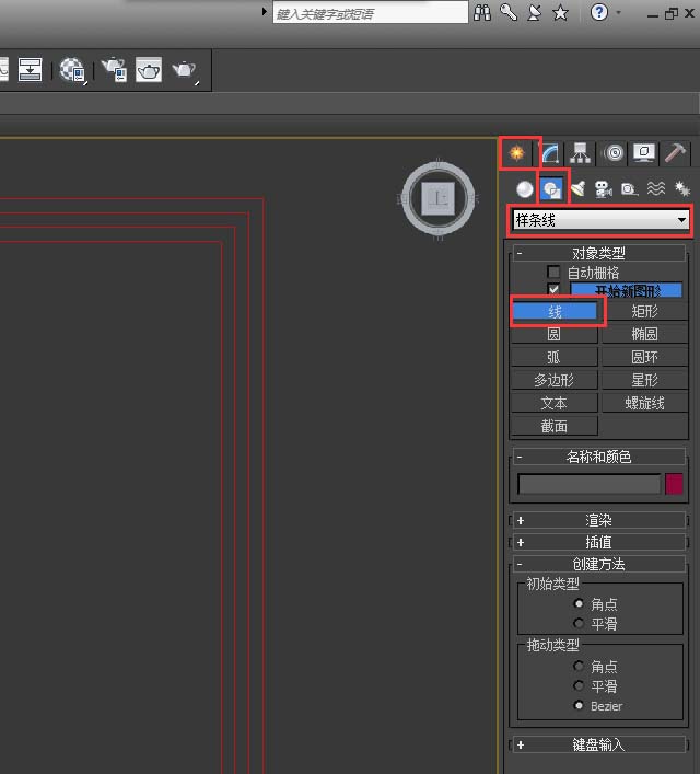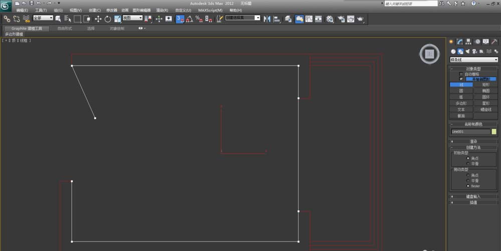4、前面的准备工作都做好后,我们就可以开始建立房体了。具体做法是:到右边创建面板点击创建→图形→样条线→线。然后按S键将捕捉打开,这时你就可以沿着导入的线描线了(注意:只需要描绘内墙线,并且每个窗户、门的地方都要留两个点,也就是说只要墙线跟别的线有交点了,我们就要点击一下这个点)描线时注意不要断,一定要一次性画到开始时那个点。描线时只可以按鼠标左键,和键盘上的I键。