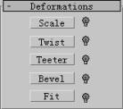 Deformations中包括Scale(缩放)、Twist(倾斜)、Teeter(倒角)、Bevel(扭曲)、Fit(拟合)5种修饰器。