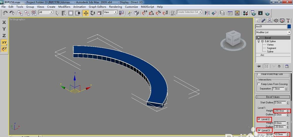 3、为添加轮廓后的圆弧加一个【Bevel】(倒角)命令,调整倒角的参数,如下图所示。
