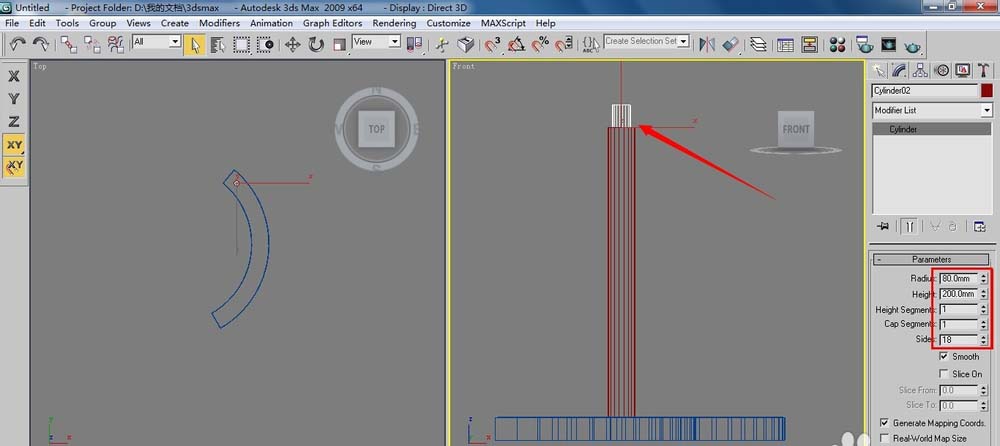 5、在前视图中沿Y轴复制一个圆柱体,修改一下参数,将其放置在大圆柱体上方,参数及位置如下图所示。