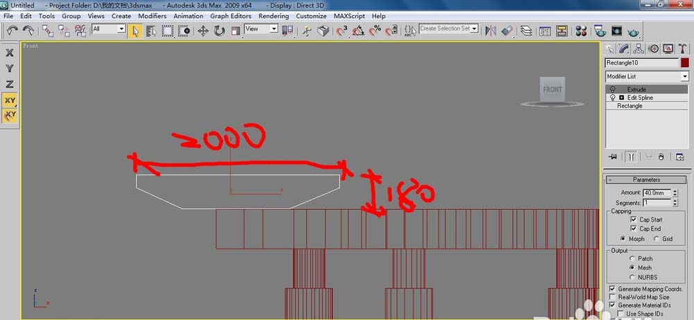10、在顶视图中移动调整后的矩形到合适的位置,执行【Extrude】(挤出)命令,设置挤出的高度为40,然后旋转一下角度,效果如下图所示。
