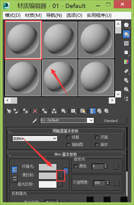 5、点击材质编辑器选项,在弹出的对话框内选择一个材质球,并找到漫反射后的选择框,如图所示;