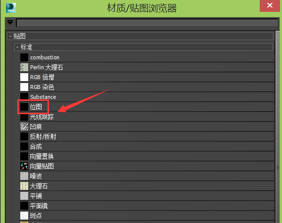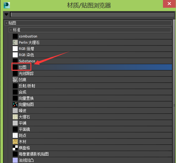 8、点击贴图选择框在弹出的对话框内选择位图选项,点击位图选项,在弹出的打开贴图对话框内找到我们的贴图,如图所示: