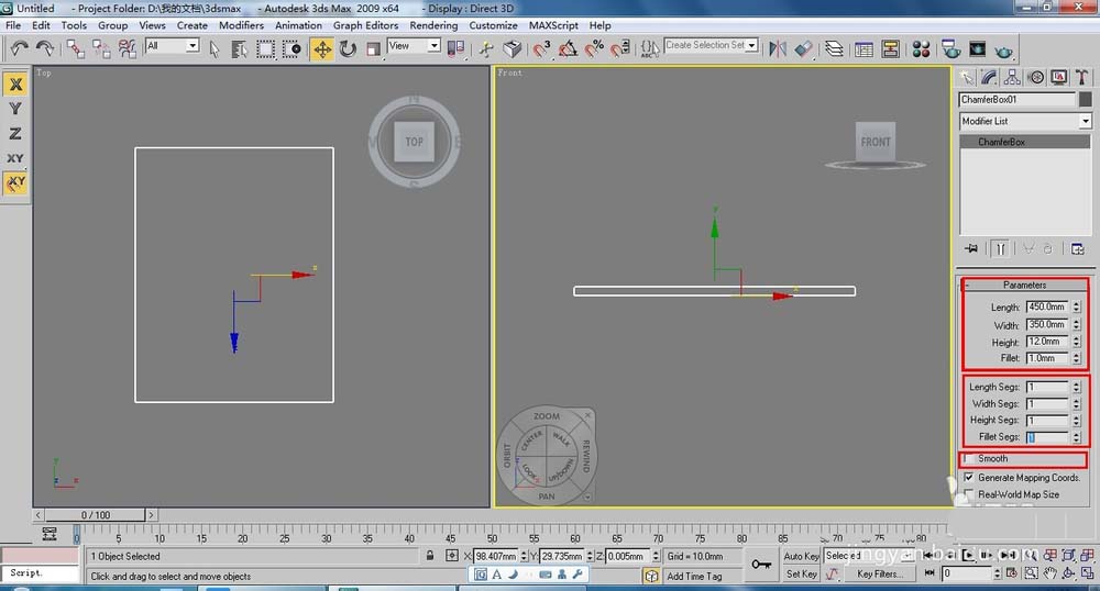 1、单击(创建)/(几何体)/ChamferBox(切角长方体)按钮,在顶视图中单击并拖动鼠标创建一个切角长方体,作为“套几面“,参数如图。