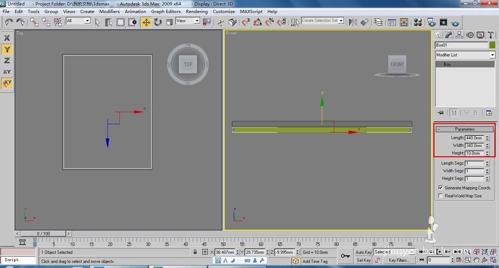 2、在顶视图中创建一个340*440*10的长方体,作为套几的”支架“,形态及参数如图。