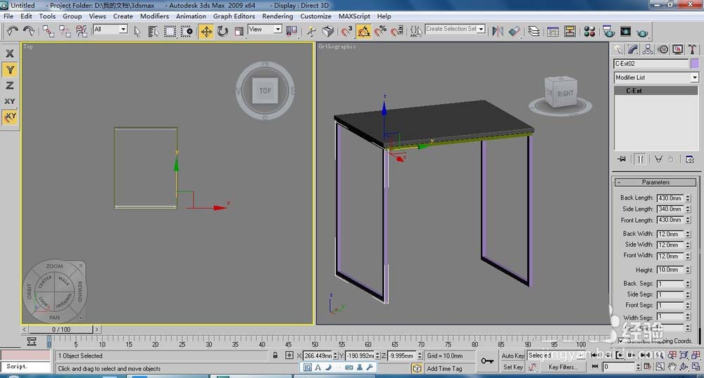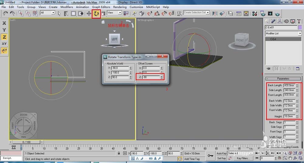 3、单击(创建)/(几何体)/C-Ext(C形拉伸体)按钮,在左视图中单击并拖动鼠标创建一个C-Ext。进入修改命令面板,修改各项参数,沿Z轴旋转-90度,如图。