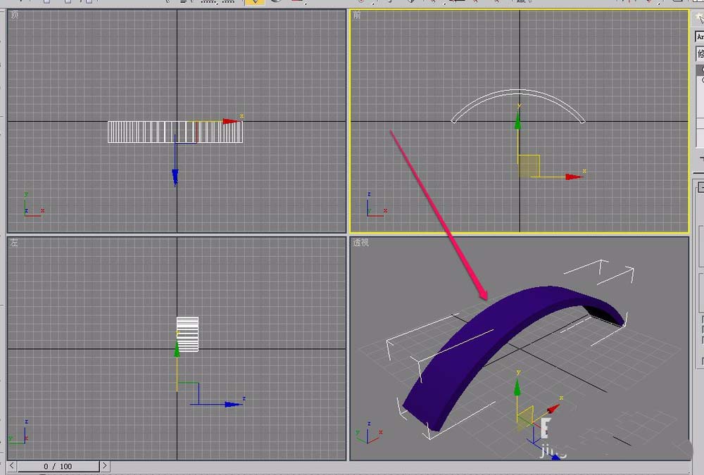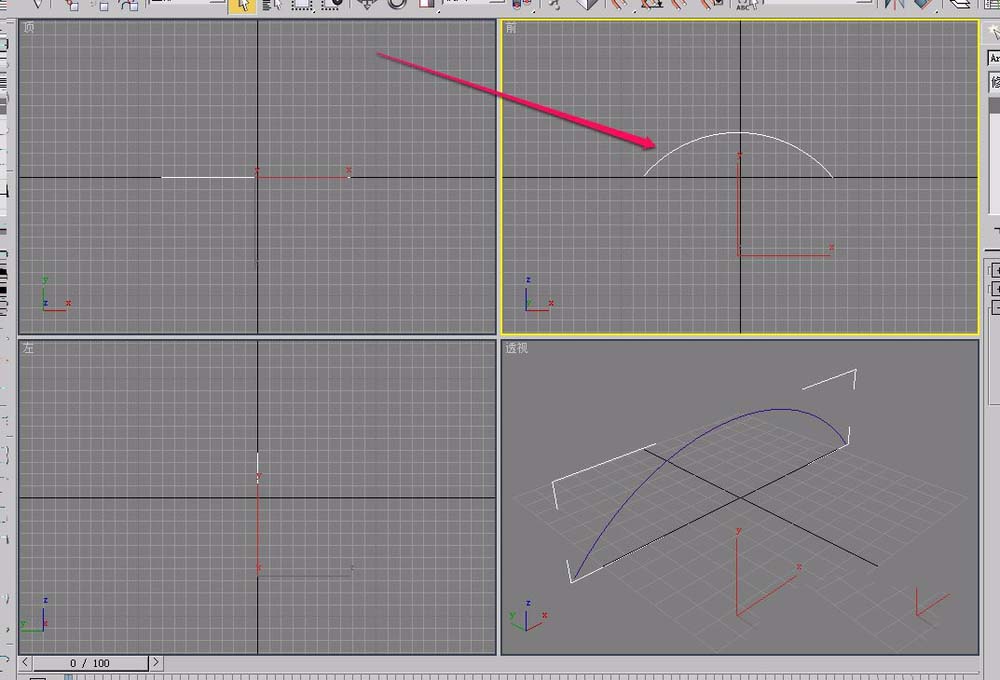 1、打开3dsmax软件,在“前”视图中绘制一段弧。