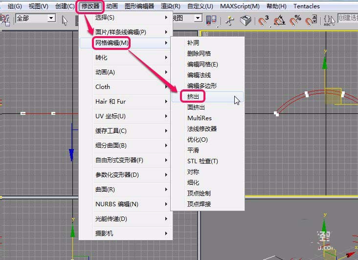 6、打开“修改器”菜单,选择“网格编辑”项中的“挤出”命令。
