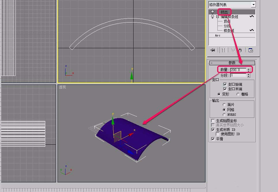 8、在“挤出”修改器中,打开“参数”卷展栏,将“数量”设置为 200.0。这时,瓦片就比较好看了。
