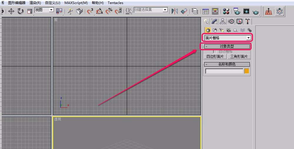 3、选择下拉菜单中的“面片栅格”选项,打开“对象类型”卷展栏。
