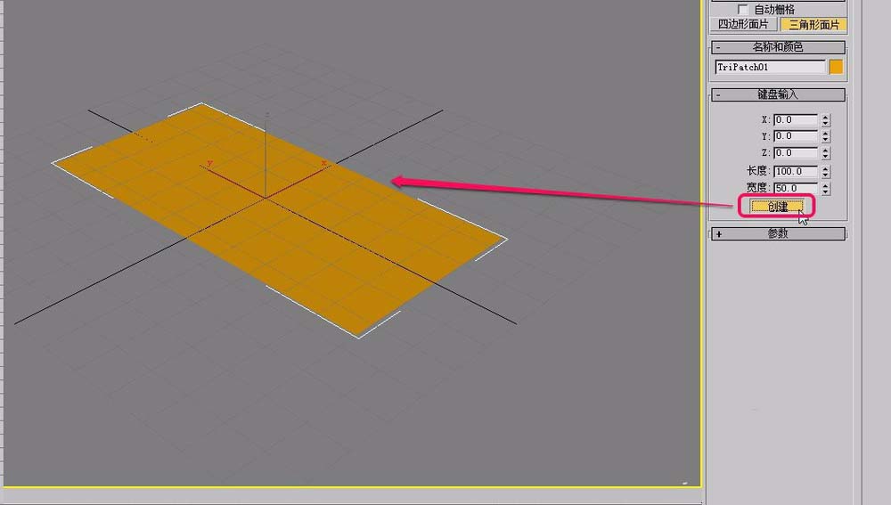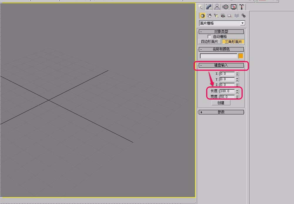 6、还可以打开“键盘输入”卷展栏,手动输入“长度”和“宽度”数值。单击“创建”按钮,创建出三角形面片。