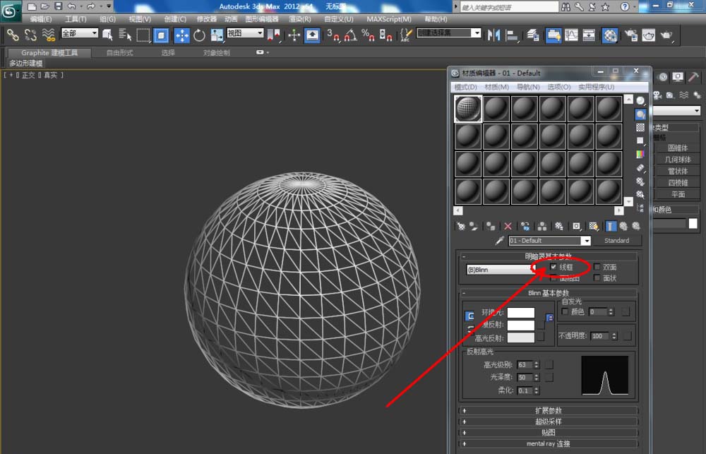 3、点击【材质编辑器】,将白色材质球中的【线框】和【双面】勾选,点击下方的【扩展参数】,设置好线框的参数大小后,点击渲染,制作出线框球体模型(如图所示);