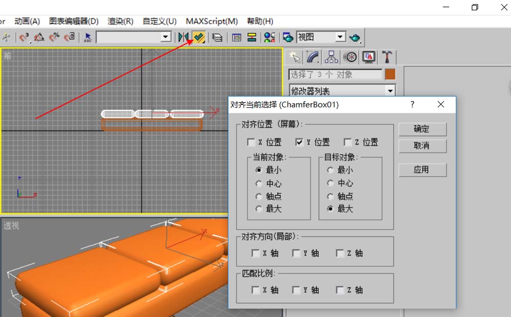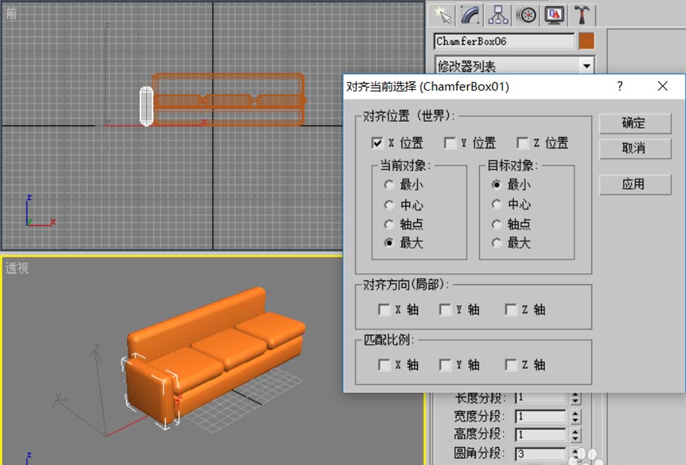 9、选择刚创建的长方体,向右移动复制一份,并与大长方体对齐。至此,沙发模型创建完成。