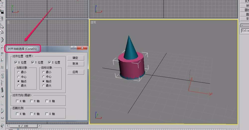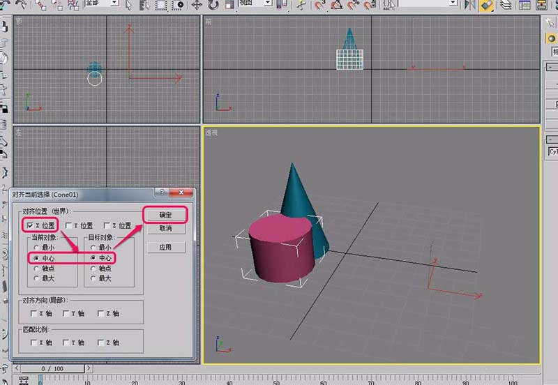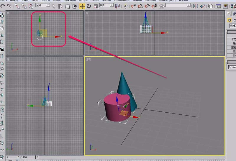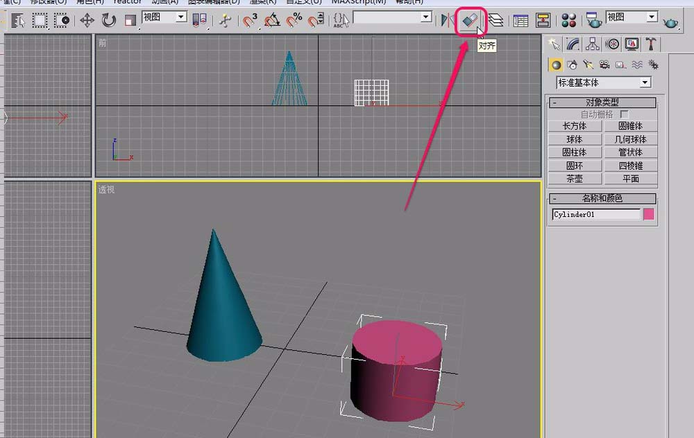 7、最后圆柱体和圆锥体的对其效果如图。在“顶视图”中,2个物体的对齐效果较清晰。