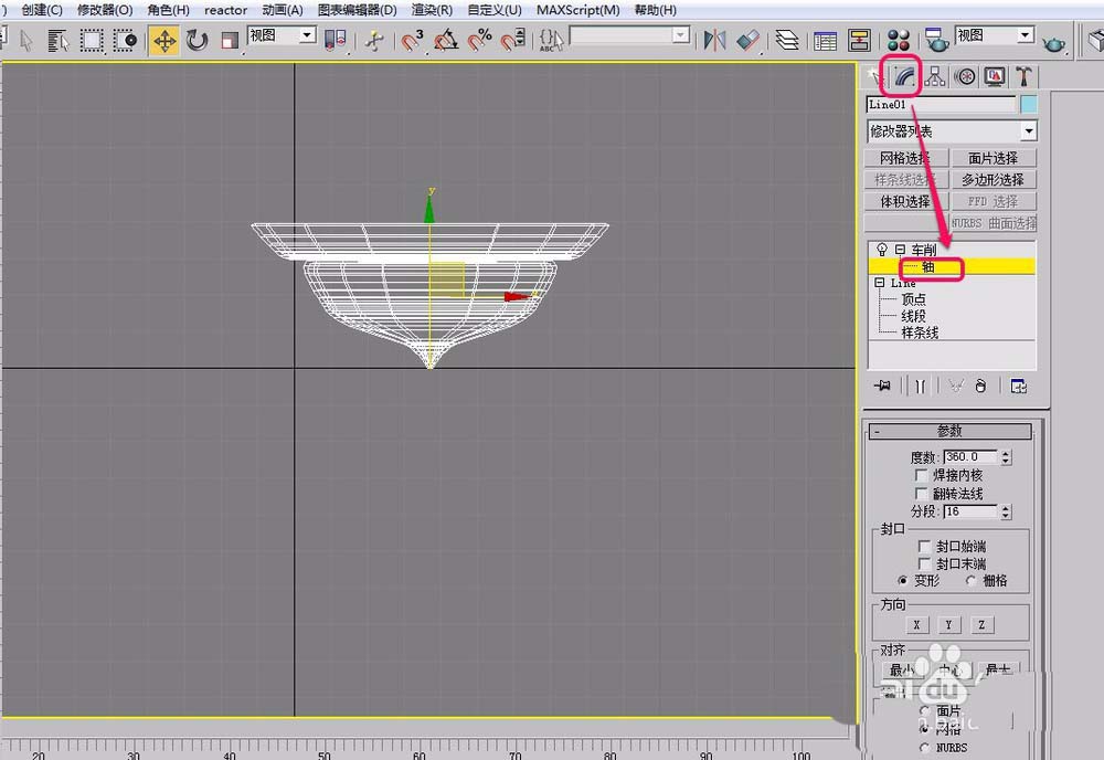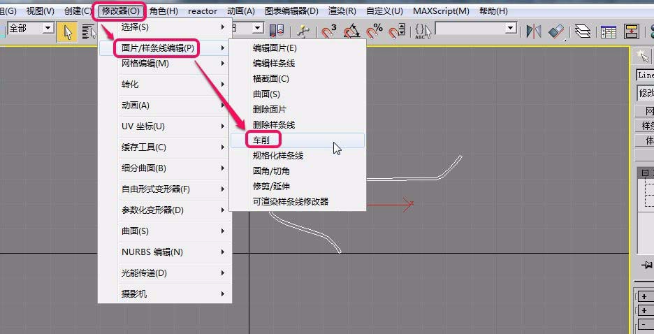 4、打开“修改器”菜单,选择“面片/样条线编辑”项中的“车削”命令。