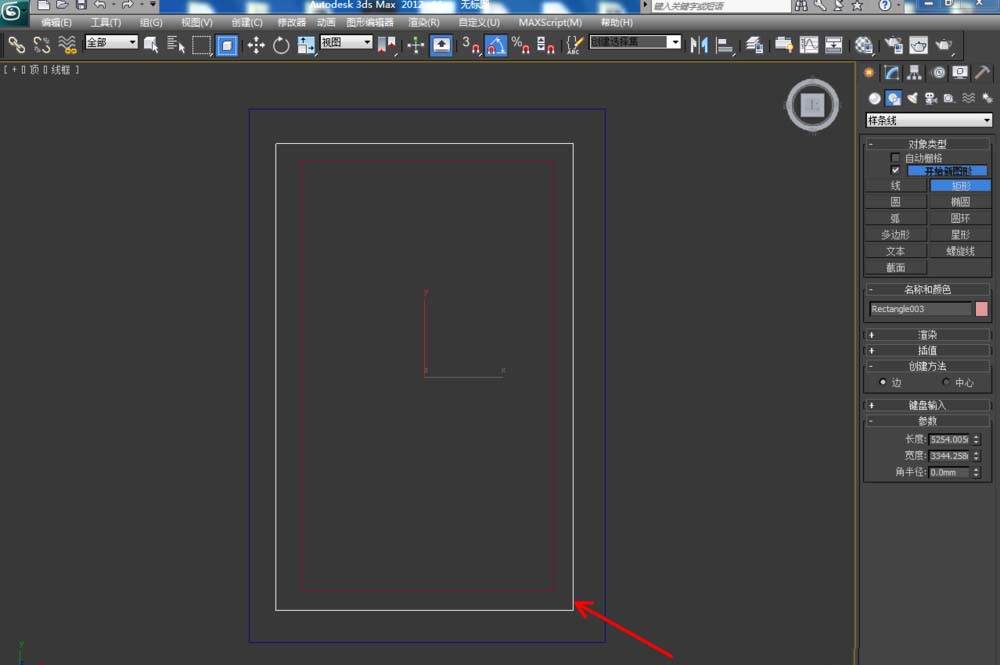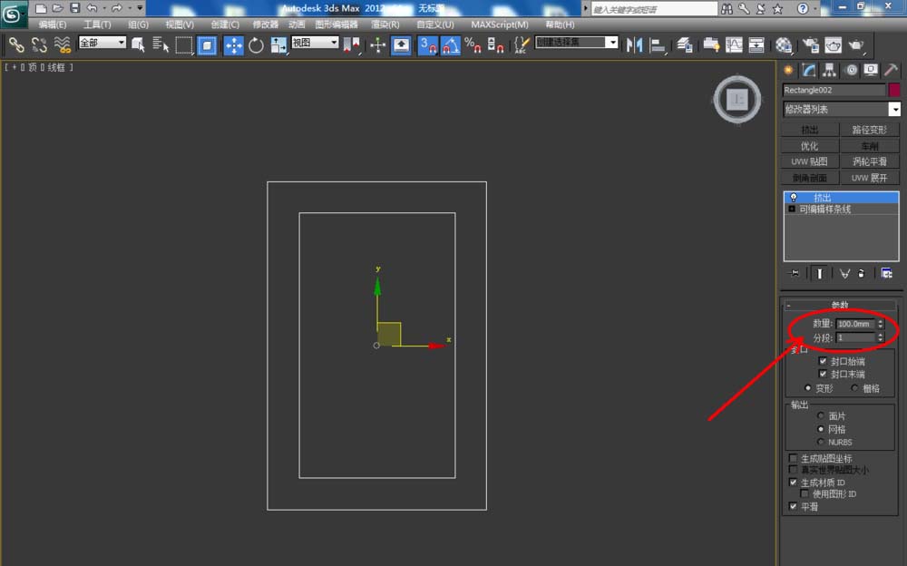 1、打开3Dmax2012软件,点击【创建】-【图形】-【矩形】,在作图区域绘制一个矩形图案并按图示设置好矩形的各个参数。选中图案,点击【修改】-【挤出】,挤出数量设置为:100;