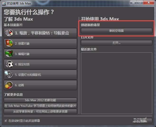 1、首先,打开3dMax软件,点击“新的空场景”按钮,如图所示。