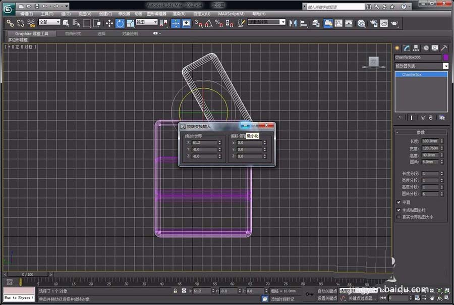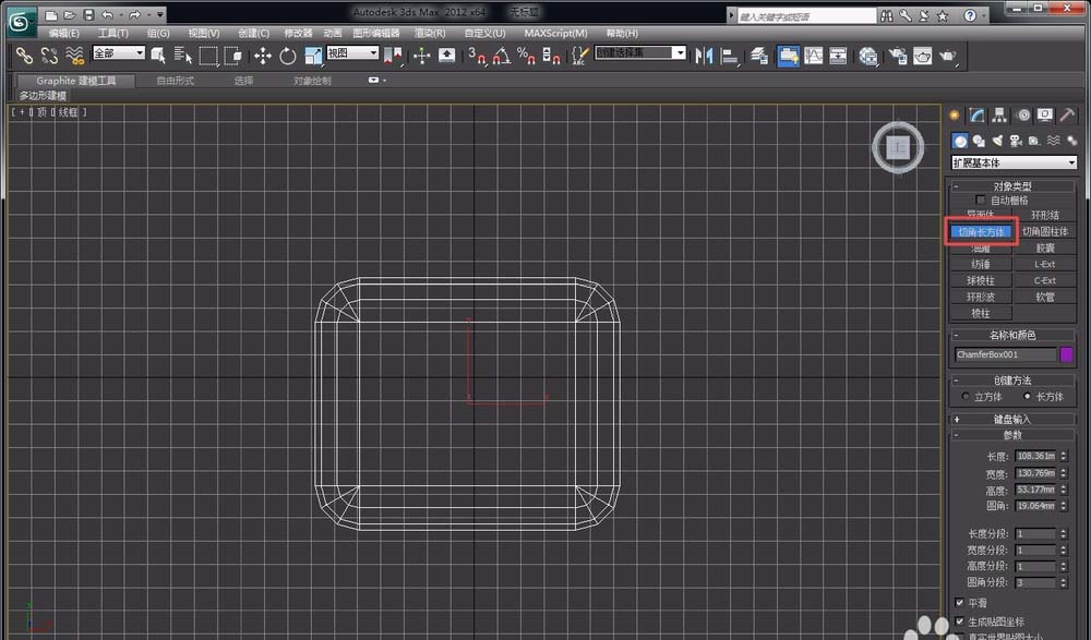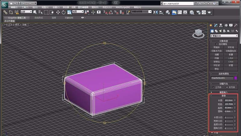 2、点击右侧的“扩展基本体”选项,用“切角长方体”绘制出一个切角的长方体,并调整其参数,如圆角半径、圆角分段等,使其看起来更像圆角长方体。