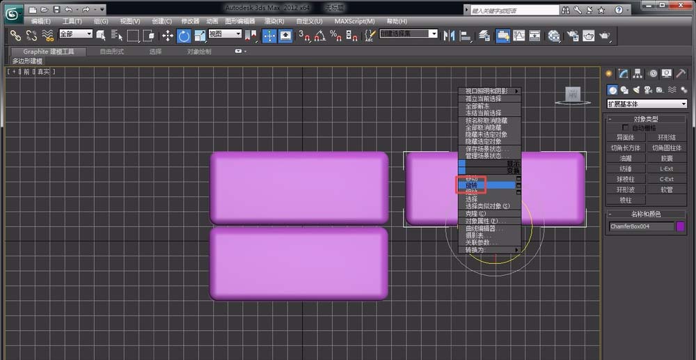 6、再复制出一个圆角长方体,打开左视图窗口,右键鼠标点击“旋转”选项,旋转一个任意角度,并将其移动到合适的位置。