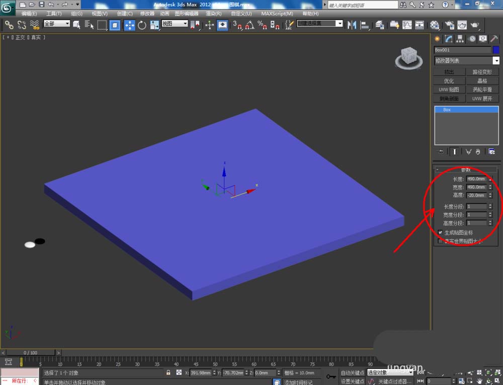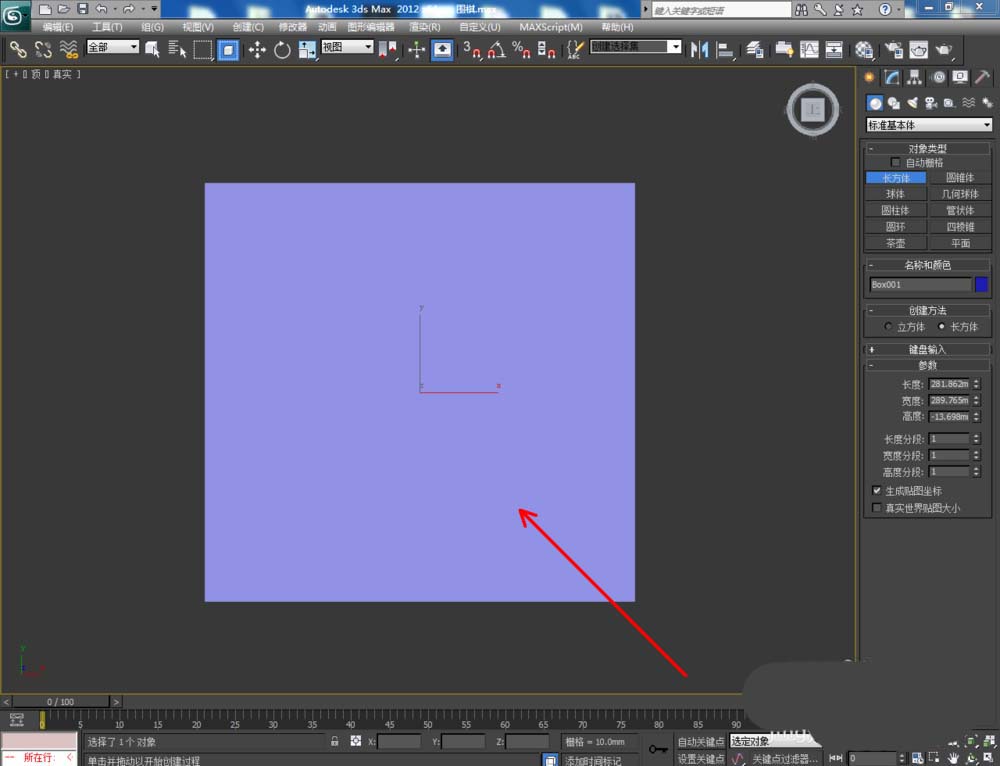 5、点击【创建】-【几何体】-【长方体】,在作图区域绘制一个长方体模型并按图示设置好模型的各个参数。选中模型,点击【对象颜色】将模型的对象颜色设置为:白色;