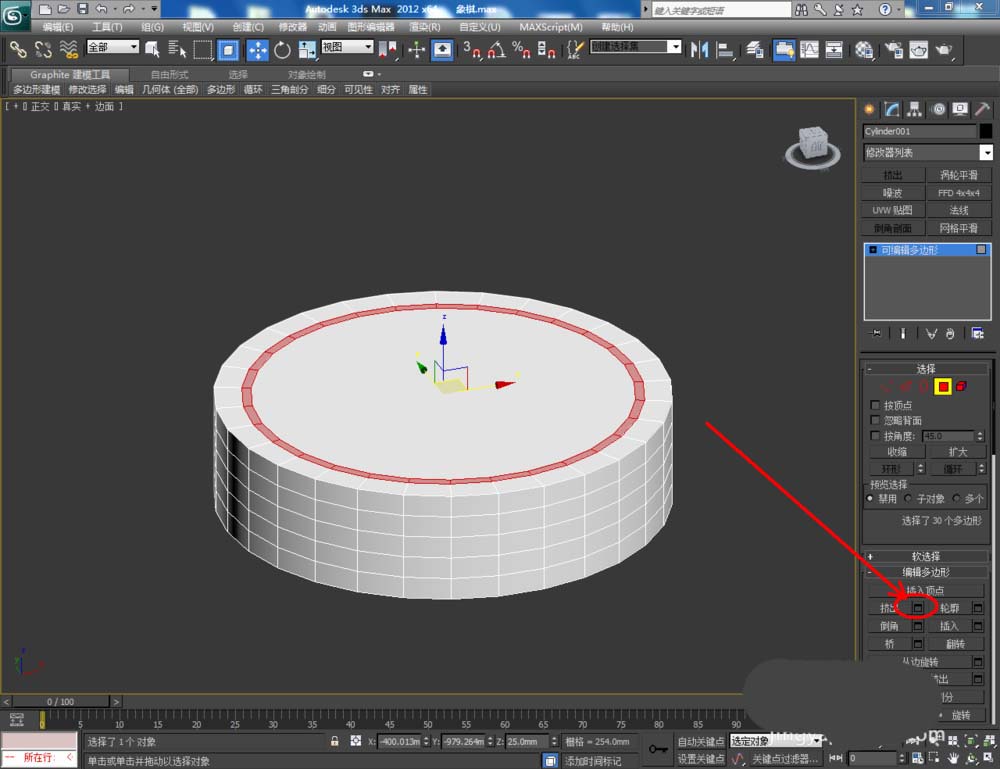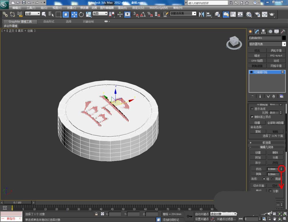 6、点击右边工作区中的【多边形】图标,选中“帥”面,按图示拉动【挤出】旁边的小三角对选面进行向内挤出。完成象棋模型主体部分模型的制作后,对模型进行细化处理(如图所示);
