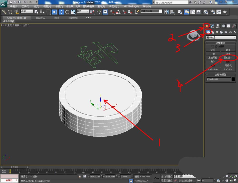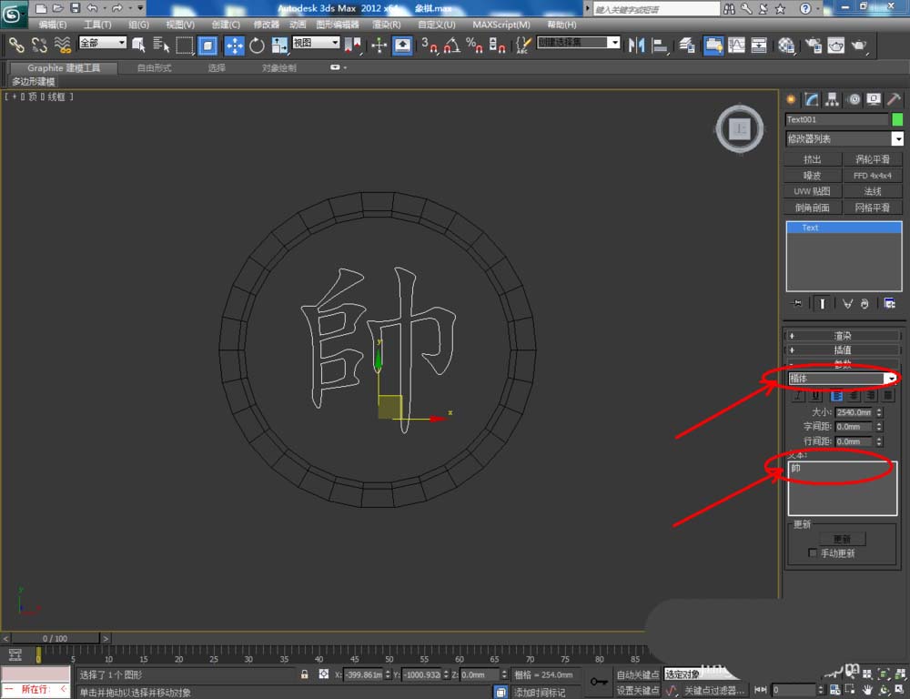 5、点击【创建】-【图形】-【文本】,在作图区域制作一个“帥”字文本,调整好文字大小并将字体设置为:楷体。选中模型,点击【创建】-【几何体】-【复合对象】-【图形合并】,点击【拾取图形】拾取刚刚制作好的文字图案。点击鼠标右键-【转换为】-【转换为可编辑网格】(如图所示);