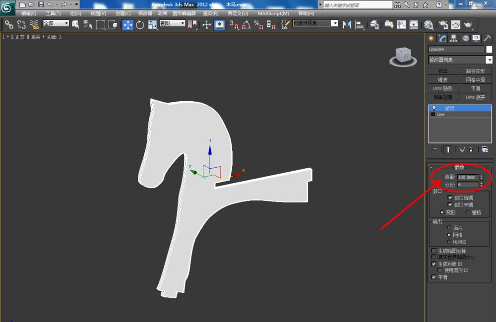4、点击【创建】-【图形】-【线】,在作图区域绘制出另外一个多边形图案。同样对图案上的点进行移动和圆化处理,完成摇摇马座椅板块图案的绘制。完成后,点击【挤出】,按图示设置好挤出的参数,并转化为可编辑多边形进行切角处理(如图所示);