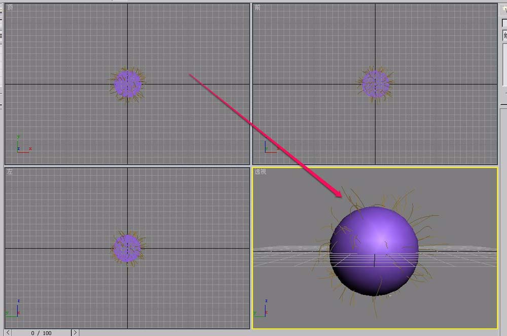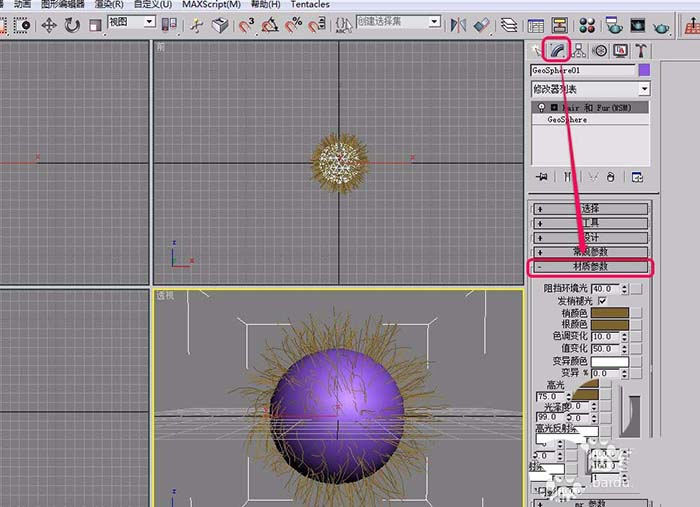 1、打开3ds max软件,在视图中创建一个已经应用了“Hair和Fur”修改器的几何球体。