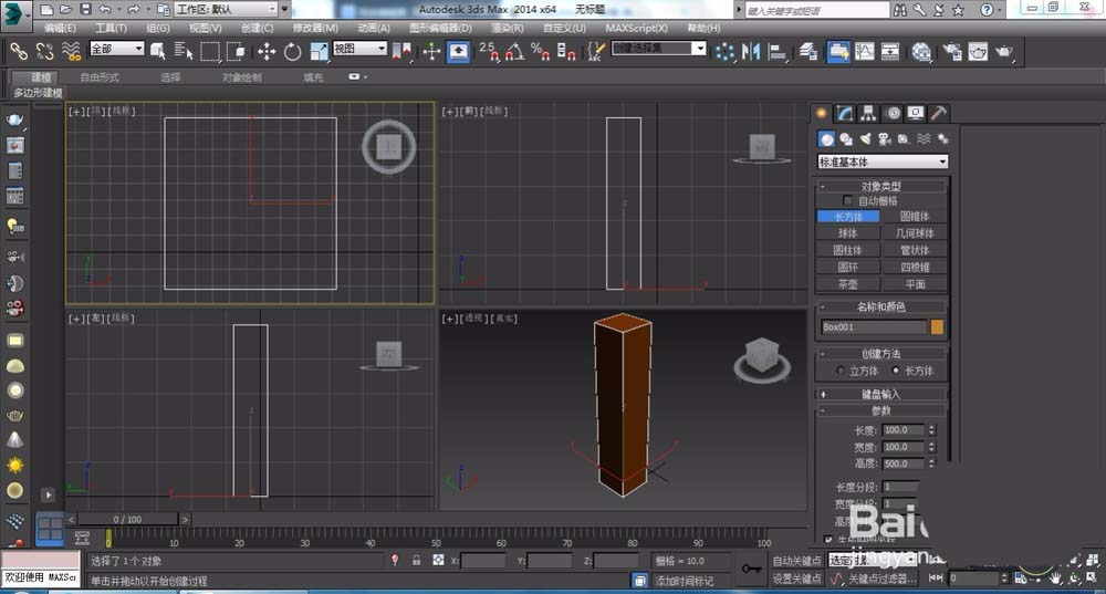 1、在顶视图创建一个竖直的巧克力色长方体,它的长宽高及其各种参数如下面图纸所示。