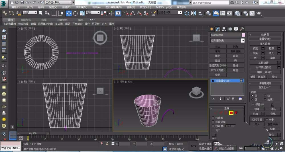 5、选择圆柱体,把它转变成可编辑多边形,选择最上面的面并删除掉,如下面效果图所示。