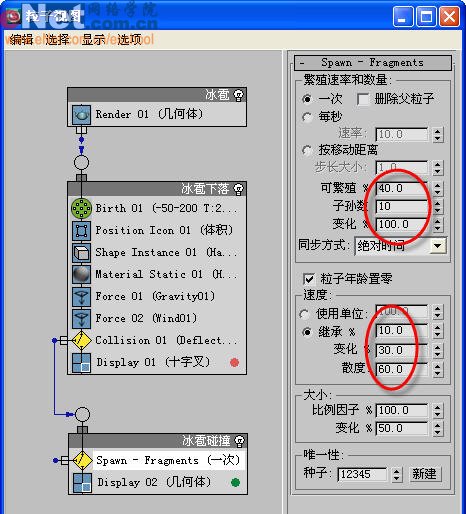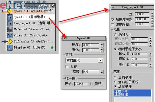 11、在“冰雹碰撞”事件中增加“speed”、“keep apart”等项,并相应调整它们的参数,如图11所示。其他的几项可从冰雹下落事件中拷贝(按住ctrl,用鼠标再依次点击它们进行复制)。