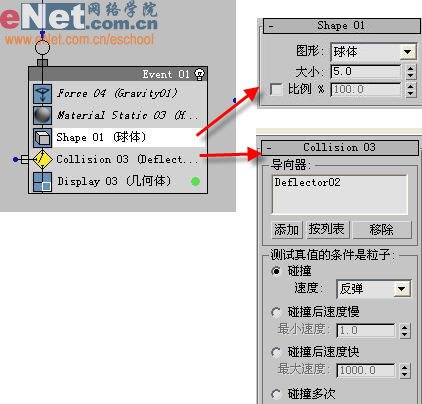 小提示:这里冰雹受到第一次碰撞后,弹起来又受到了重力及发生与Deflector02碰撞的事件。