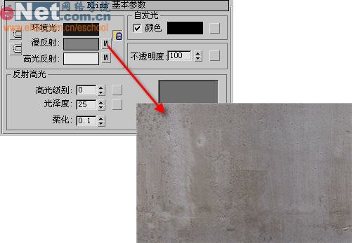 1、打开材质编辑器,选中第一个样球,打开“blinn基本参数”卷展栏,定义环境光颜色、为漫反射指定一贴图,并将它复制给高光反射、凹凸后面的“none”按钮,如图13所示。