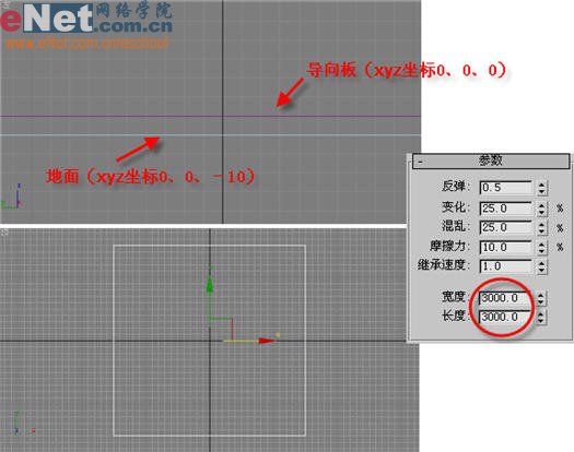 2、点击“创建”命令面板中的“空间扭曲”按钮,选择下拉列表中的“导向器”项,进入其对象类型面板,单击“导向板”按钮,在顶部视图中拖拽出一个导向板Deflector01,作为冰雹下落后碰撞到的地面,调整其参数,并将其放置于x为0、y为0、z为0的位置,如图2所示。