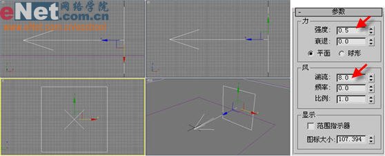 4、继续在“力”项对象类型中单击“风”按钮,在左视图中绘制一风Wind01,并调整其参数,如图4所示。
