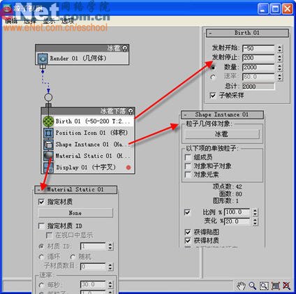 8、继续在粒子流修改属性面板上操作,在“设置”栏下勾选“启用粒子发射”项,点击“粒子视图”按钮,打开“粒子视图”窗口,修改“event 01”为“冰雹下落”,删除掉“speed”、“shape”、“rotation”等项,添加“shape instance”、“mterial static”两项,如图8所示。