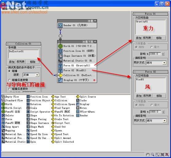9、继续在“粒子视图”窗口中操作,从仓库中拖拽出两个“force”,分别为重力、风;从仓库中拖拽出一个“collision”,为其设定参数,如图9所示。