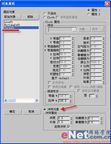 2、选中Rectangle01,打开“修改”命令面板中的“cloth”项,单击“对象”栏下的“对象属性”按钮,添加冲突对象Torus01,如图10所示。